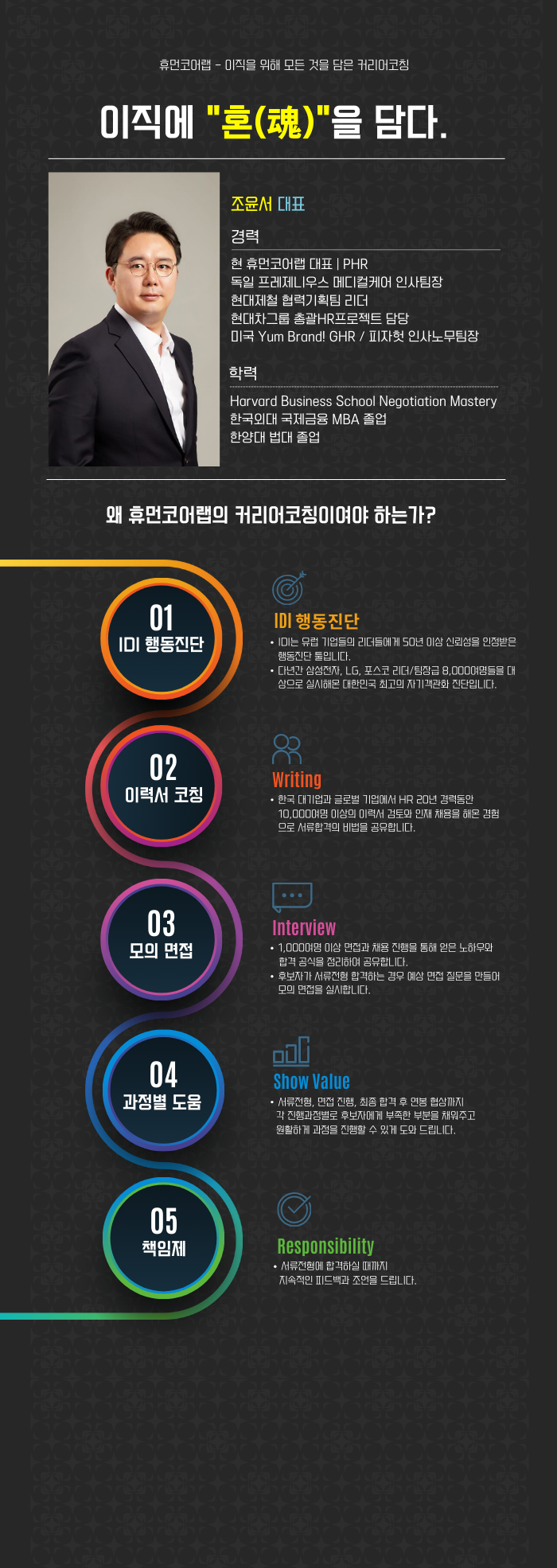 삼성전자, LG디스플레이, SK하이닉스, 현대자동차, 제일기획, 쿠팡, 마이크로소프트, USARMY, Google 등 최고의 기업들에 최종합격까지 커리어코칭을 진행했습니다.