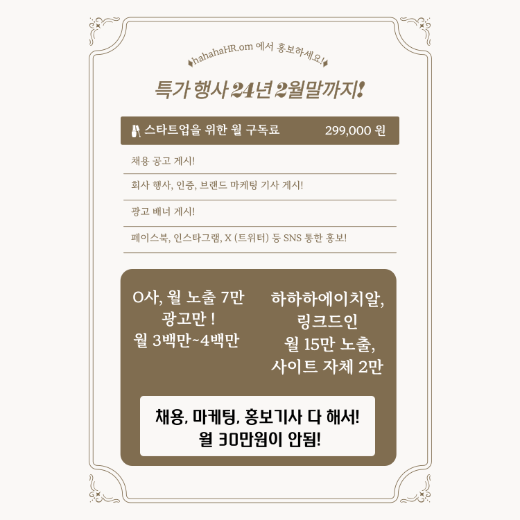 한 달 평균 18만 노출되는 hahahaHR.com에 회사구독 월 299,000원! (VAT 제외)