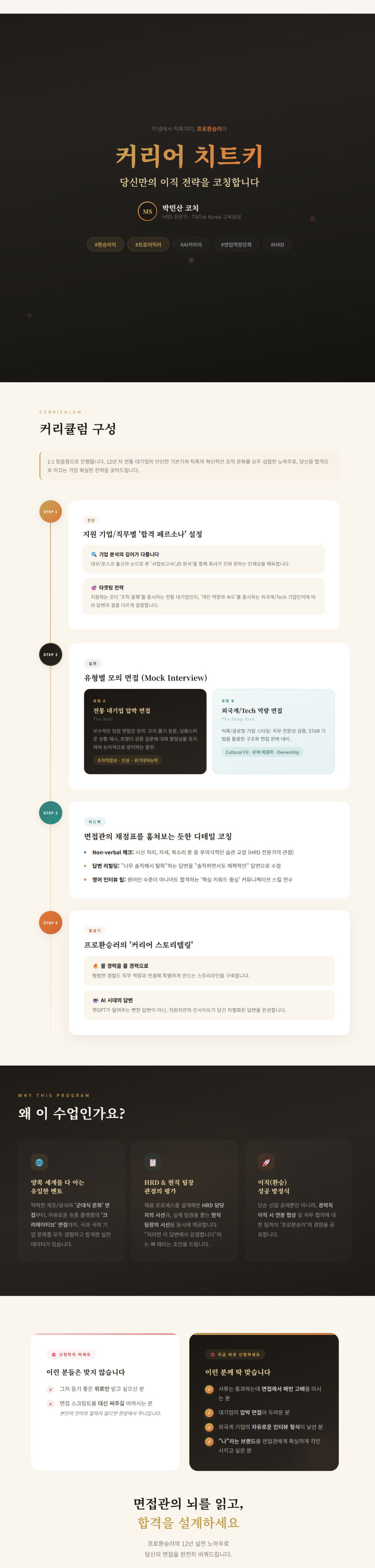 면접은 정답을 외우는 암기 과목이 아닙니다. 회사의 DNA에 맞춰 나의 언어를 바꾸는 '통역' 과정입니다. 12년 차 전통 대기업의 단단한 기본기와 틱톡의 혁신적인 조직 문화를 모두 섭렵한 노하우로, 당신을 합격으로 이끄는 가장 확실한 전략을 꽂아드립니다.